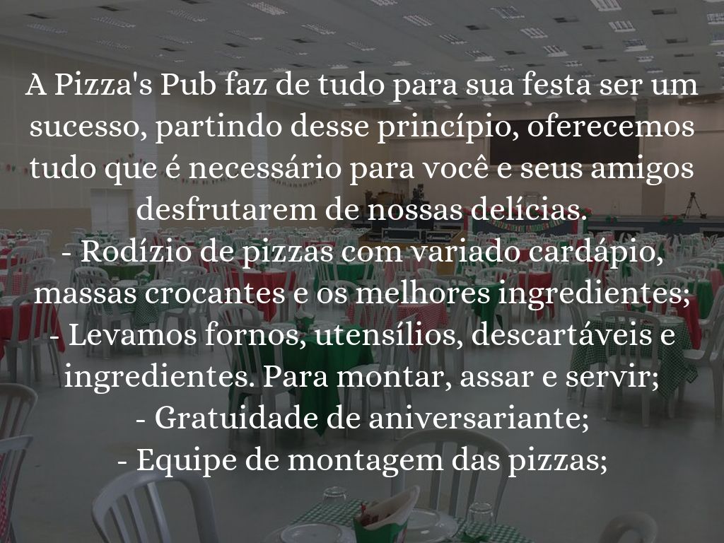 A Pizza's Pub faz de tudo para sua festa ser um sucesso, partindo desse princípio, oferecemos tudo que é necessário para você e seus amigos desfrutarem de nossas delícias.