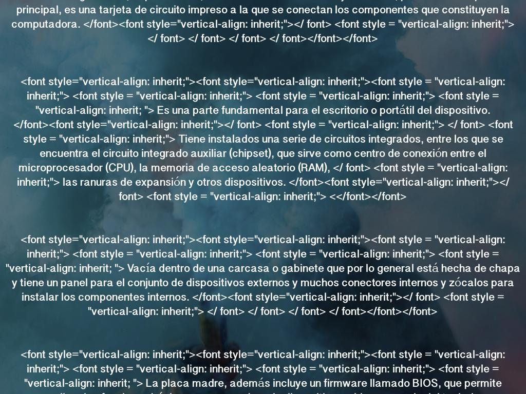 Es una parte fundamental para el escritorio o portátil del dispositivo. Tiene instalados una serie de circuitos integrados, entre los que se encuentra el circuito integrado auxiliar (chipset), que sirve como centro de conexión entre el microprocesador (CPU), la memoria de acceso aleatorio (RAM), las ranuras de expansión y otros dispositivos.