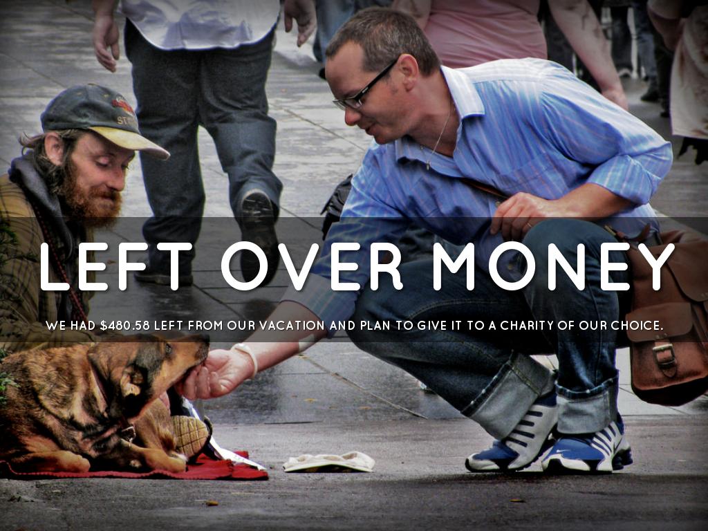 WE HAD $480.58 LEFT FROM OUR VACATION AND PLAN TO GIVE IT TO A CHARITY OF OUR CHOICE.