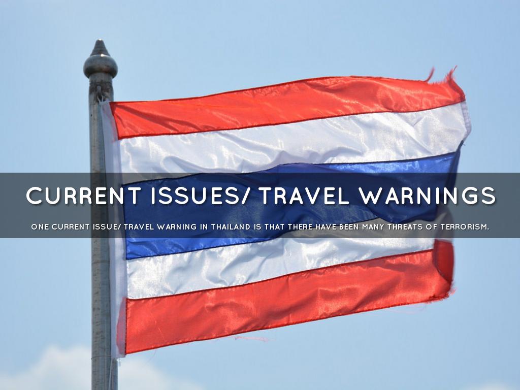 ONE CURRENT ISSUE/ TRAVEL WARNING IN THAILAND IS THAT THERE HAVE BEEN MANY THREATS OF TERRORISM.