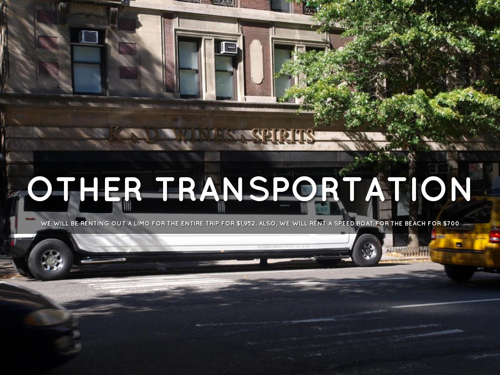 WE WILL BE RENTING OUT A LIMO FOR THE ENTIRE TRIP FOR $1,952. ALSO, WE WILL RENT A SPEED BOAT FOR THE BEACH FOR $700