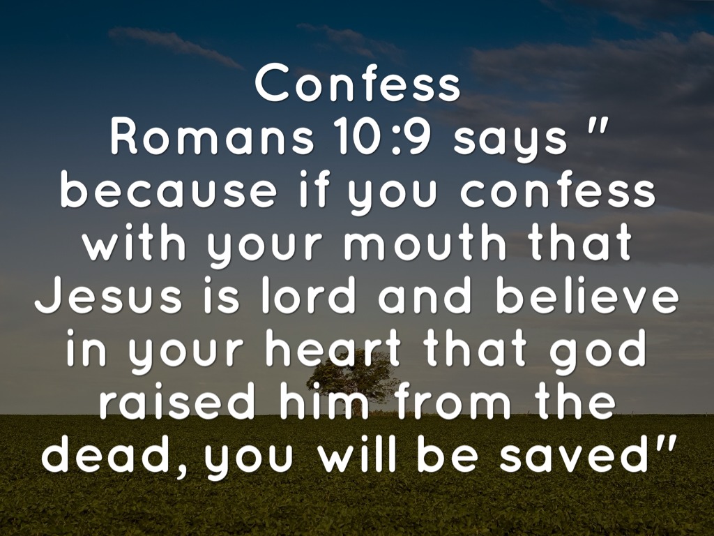 Confess Romans 10:9 says " because if you confess with your mouth that Jesus is lord and believe in your heart that god raised him from the dead, you will be saved"