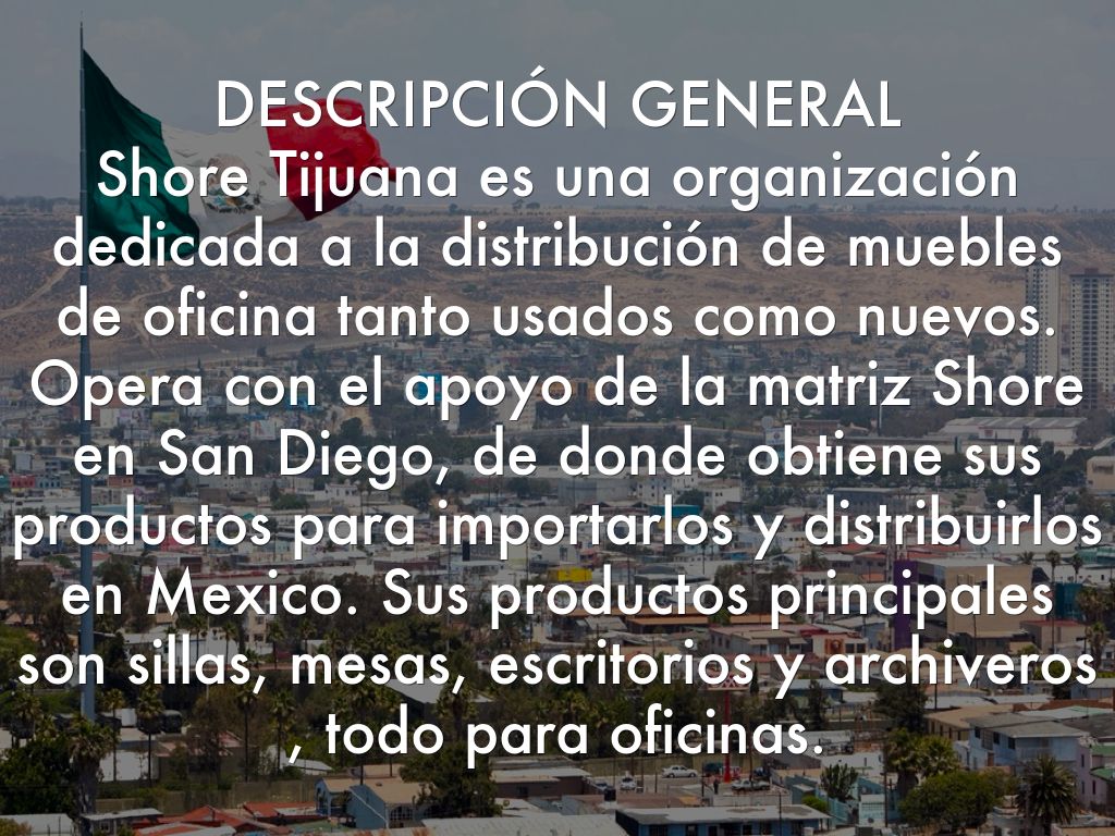 Shore Tijuana es una organización dedicada a la distribución de muebles de oficina tanto usados como nuevos. Opera con el apoyo de la matriz Shore en San Diego, de donde obtiene sus productos para importarlos y distribuirlos en Mexico. Sus productos principales son sillas, mesas, escritorios y archiveros , todo para oficinas.