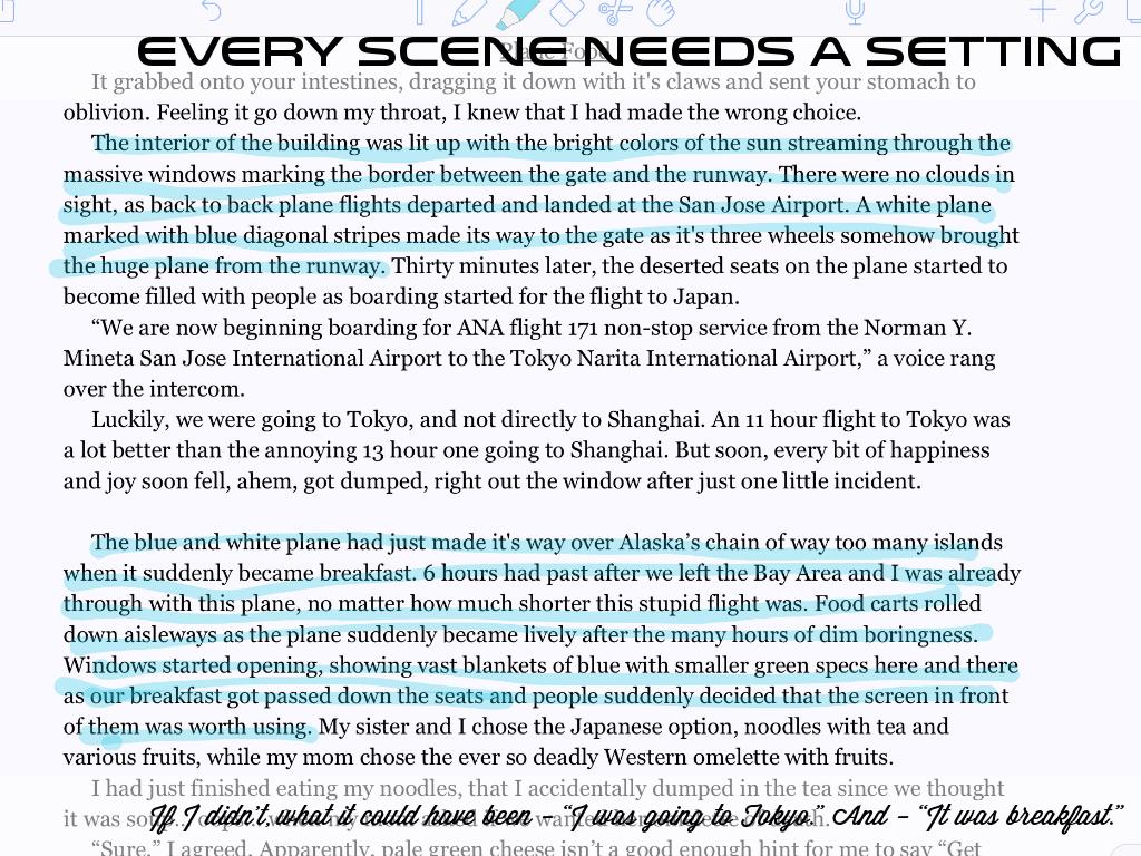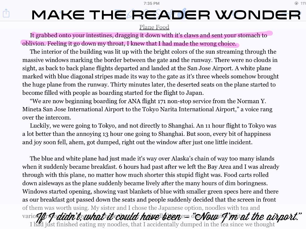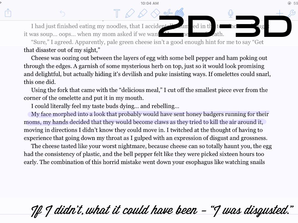I used descriptive language and actions to show what surrounding I was currently in and have them know both the setting and action in their minds while reading the story instead of just letting them have the action.
