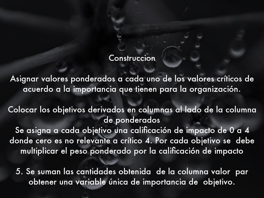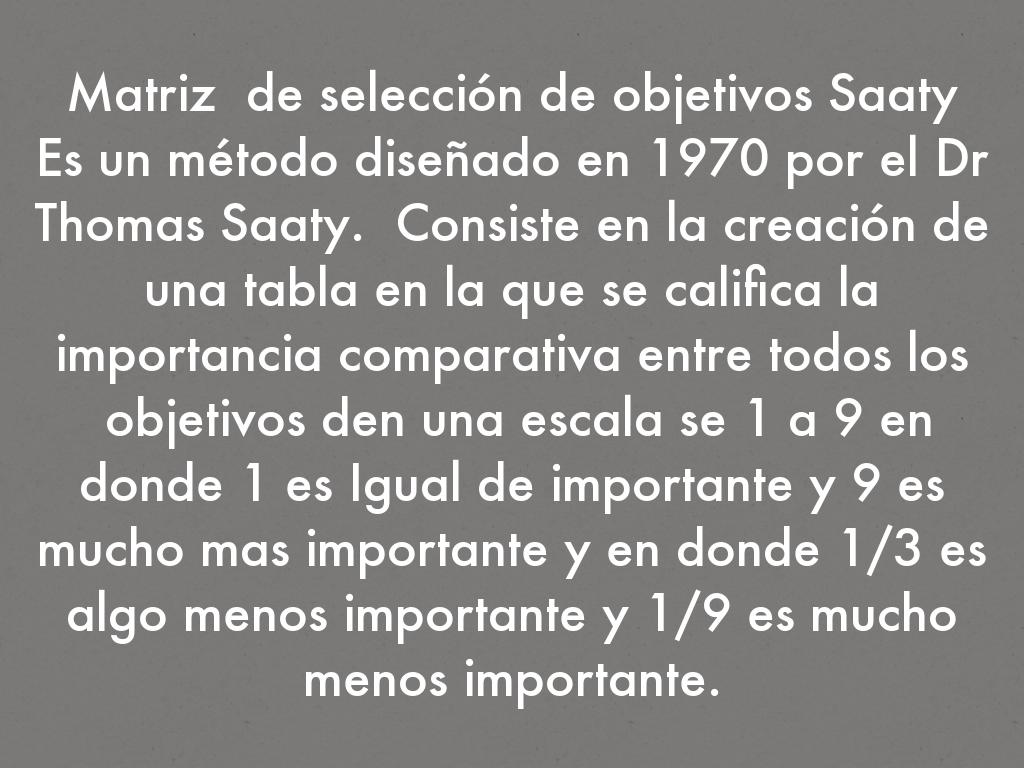Es un método diseñado en 1970 por el Dr Thomas Saaty. Consiste en la creación de una tabla en la que se califica la importancia comparativa entre todos los objetivos den una escala se 1 a 9 en donde 1 es Igual de importante y 9 es mucho mas importante y en donde 1/3 es algo menos importante y 1/9 es mucho menos importante.
