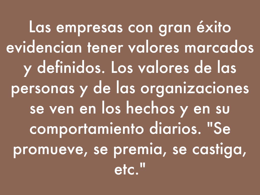 Las empresas con gran éxito evidencian tener valores marcados y definidos. Los valores de las personas y de las organizaciones se ven en los hechos y en su comportamiento diarios. "Se promueve, se premia, se castiga, etc."