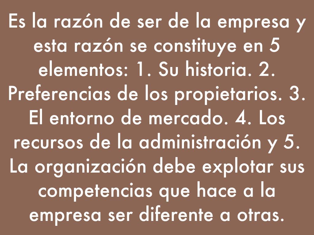 Es la razón de ser de la empresa y esta razón se constituye en 5 elementos: 1. Su historia. 2. Preferencias de los propietarios. 3. El entorno de mercado. 4. Los recursos de la administración y 5. La organización debe explotar sus competencias que hace a la empresa ser diferente a otras.