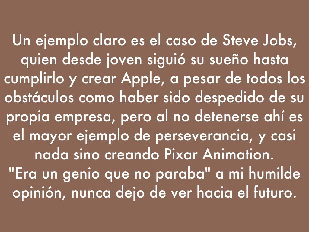 Un ejemplo claro es el caso de Steve Jobs, quien desde joven siguió su sueño hasta cumplirlo y crear Apple, a pesar de todos los obstáculos como haber sido despedido de su propia empresa, pero al no detenerse ahí es el mayor ejemplo de perseverancia, y casi nada sino creando Pixar Animation.