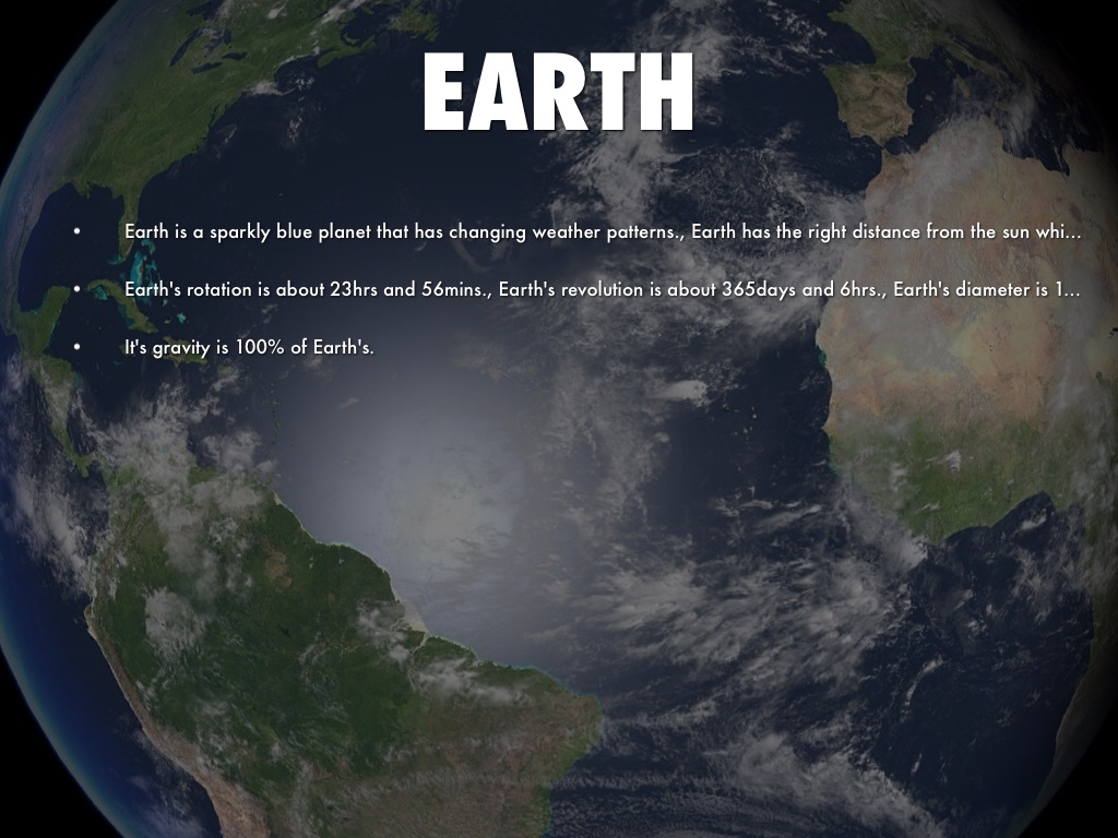 Earth is a sparkly blue planet that has changing weather patterns., Earth has the right distance from the sun which can keep the water from freezing or drying., The distance from the sun is about 8.3 light minutes.