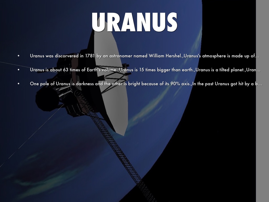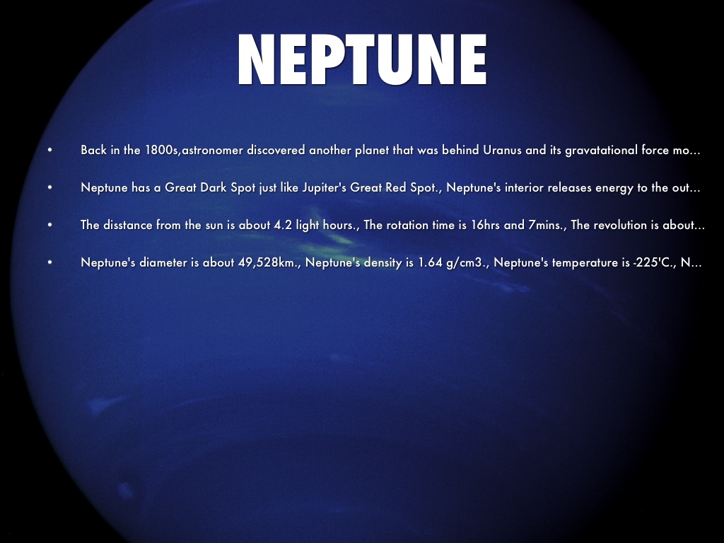 Back in the 1800s,astronomer discovered another planet that was behind Uranus and its gravatational force move Uranus off of it's path.,The planet was discovered in 1846.,Neptune's atmosphere is the exact same as Uranus.
