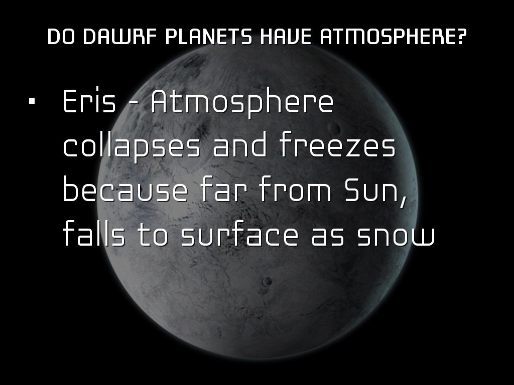 • Eris - Atmosphere collapses and freezes because far from Sun, falls to surface as snow