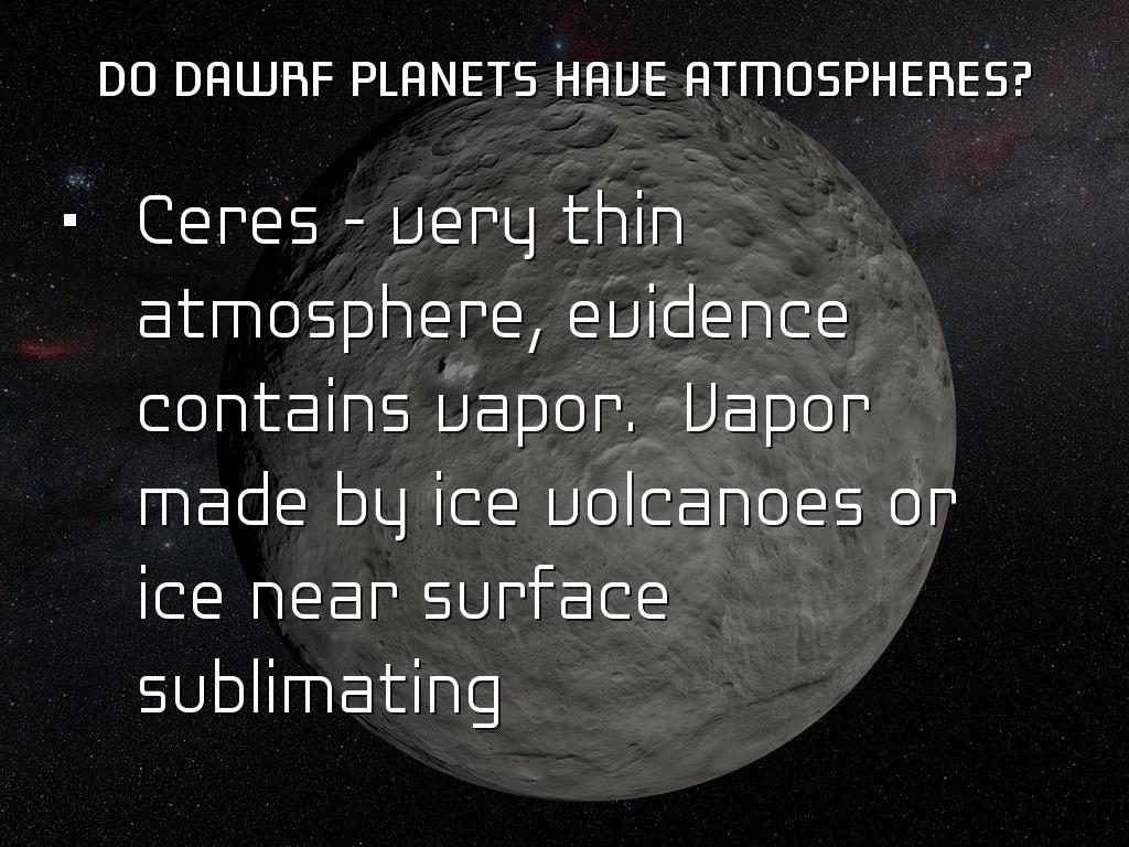 • Ceres - very thin atmosphere, evidence contains vapor. Vapor made by ice volcanoes or ice near surface sublimating