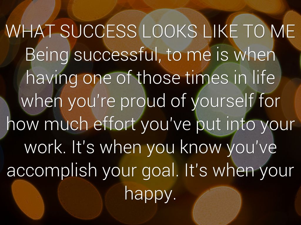 WHAT SUCCESS LOOKS LIKE TO ME Being successful, to me is when having one of those times in life when you're proud of yourself for how much effort you've put into your work. It's when you know you've accomplish your goal. It's when your happy.