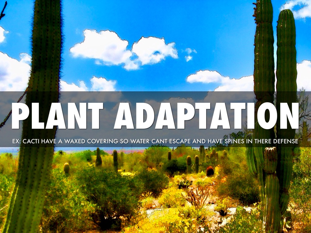 EX: CACTI HAVE A WAXED COVERING SO WATER CANT ESCAPE AND HAVE SPINES IN THERE DEFENSE