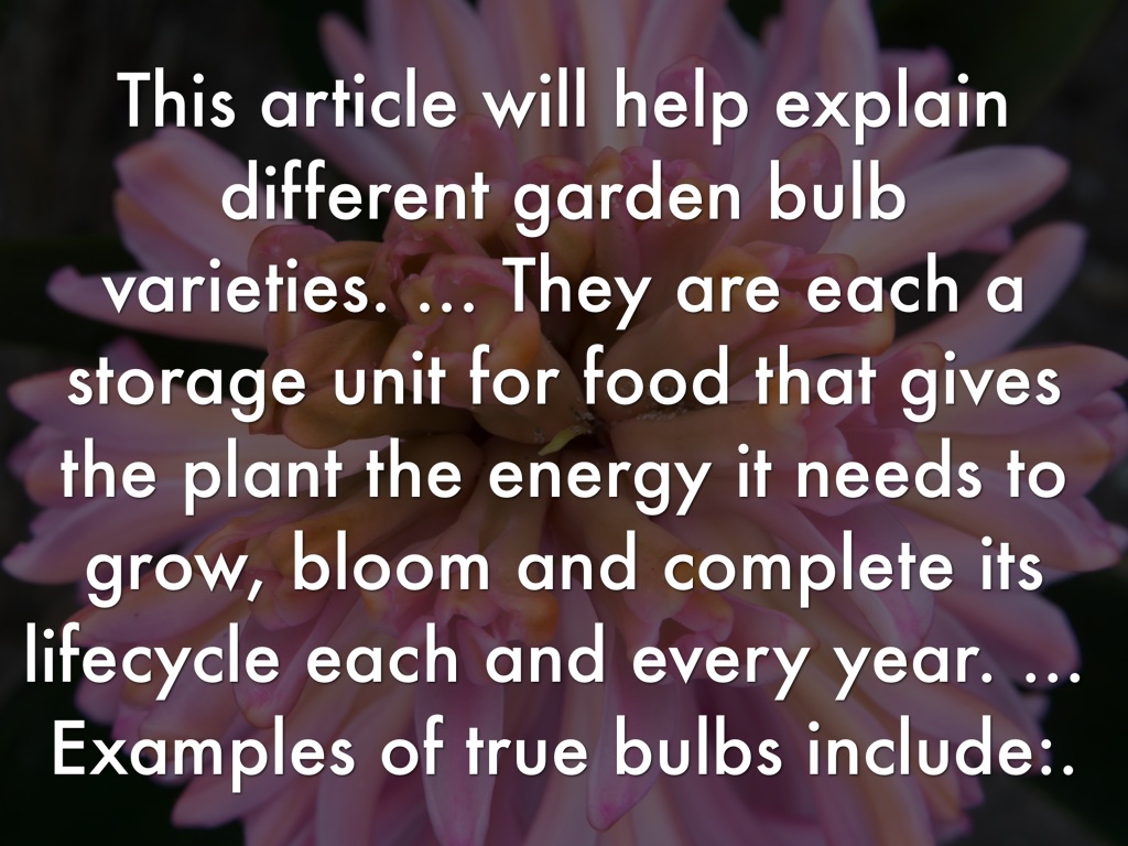 This article will help explain different garden bulb varieties. ... They are each a storage unit for food that gives the plant the energy it needs to grow, bloom and complete its lifecycle each and every year. ... Examples of true bulbs include:.