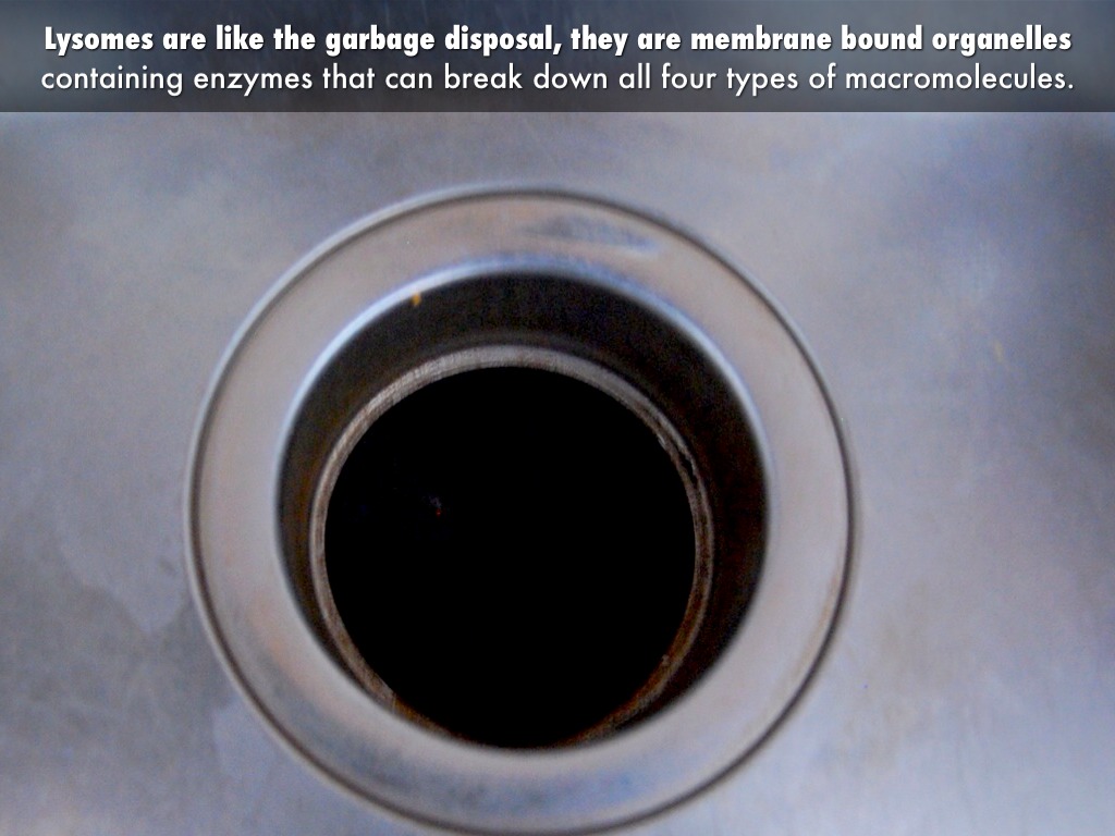 Lysomes are like the garbage disposal, they are membrane bound organelles