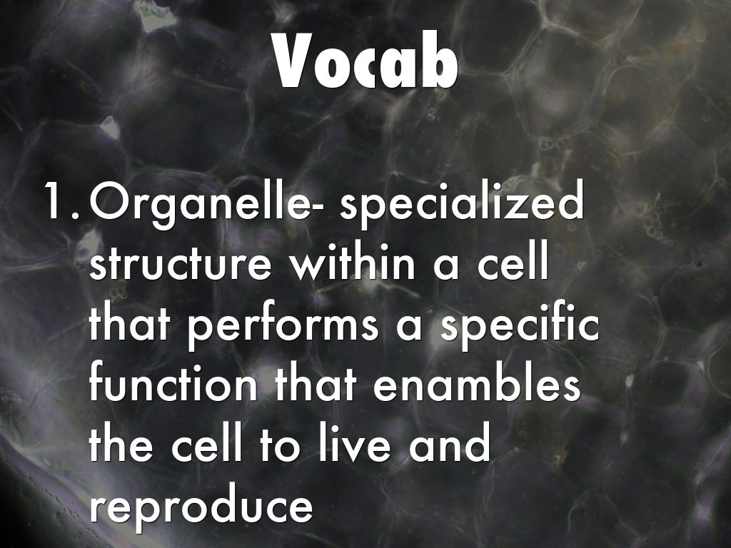 Organelle- specialized structure within a cell that performs a specific function that enambles the cell to live and reproduce