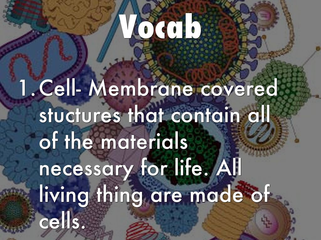 Cell- Membrane covered stuctures that contain all of the materials necessary for life. All living thing are made of cells.