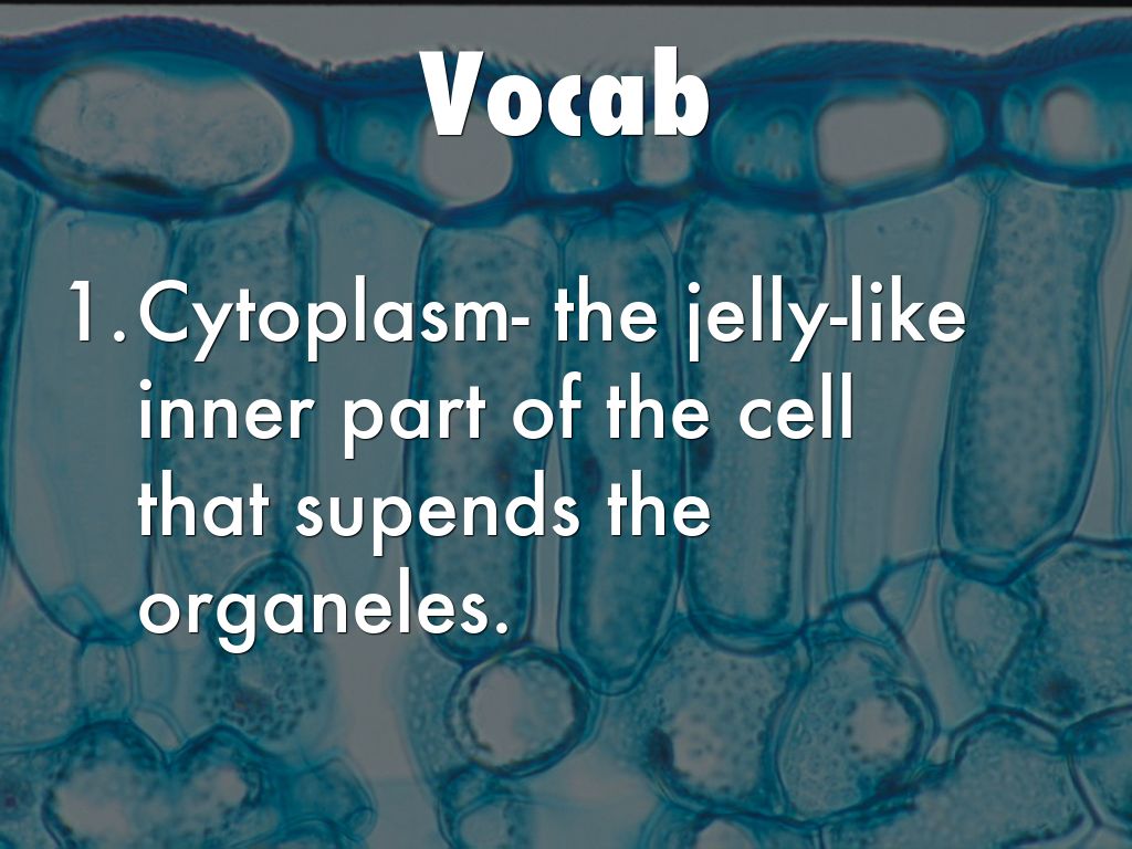 Cytoplasm- the jelly-like inner part of the cell that supends the organeles.