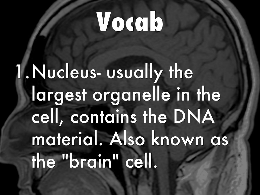 Nucleus- usually the largest organelle in the cell, contains the DNA material. Also known as the "brain" cell.