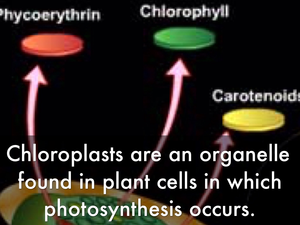 Chloroplasts are an organelle found in plant cells in which photosynthesis occurs.