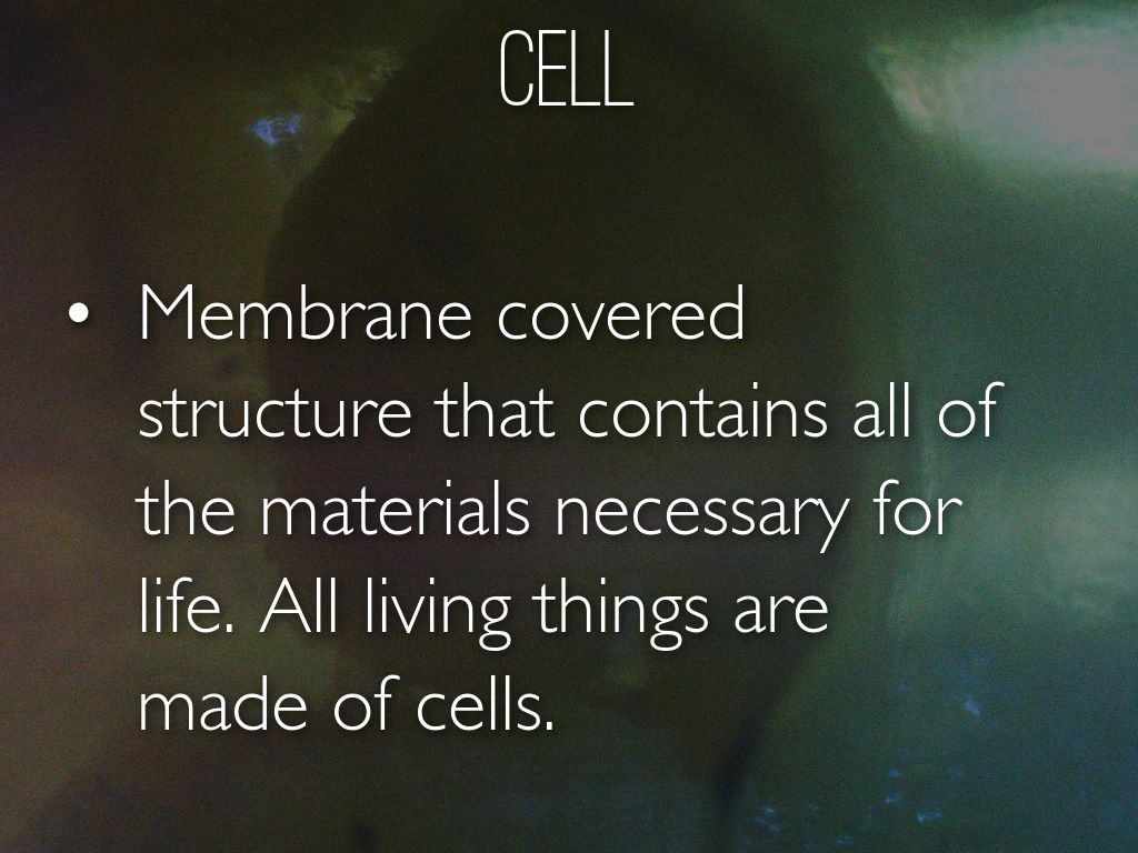 Membrane covered structure that contains all of the materials necessary for life. All living things are made of cells.