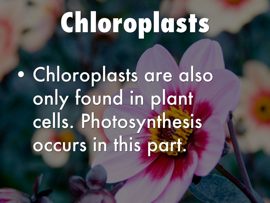 Chloroplasts are also only found in plant cells. Photosynthesis occurs in this part.