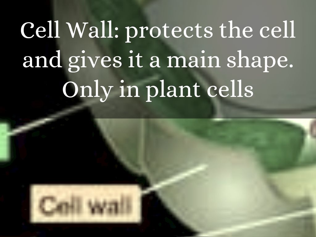 Cell Wall: protects the cell and gives it a main shape. Only in plant cells