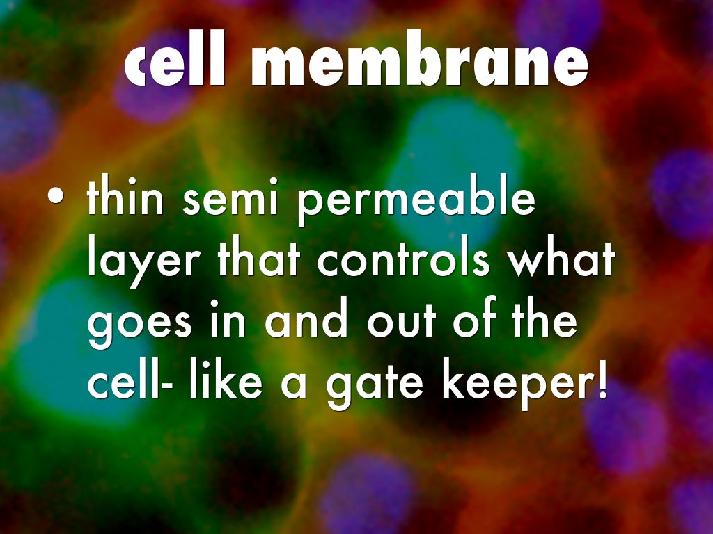 thin semi permeable layer that controls what goes in and out of the cell- like a gate keeper!