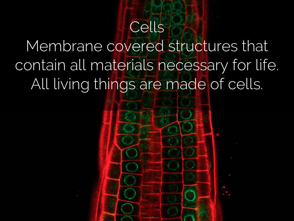 Membrane covered structures that contain all materials necessary for life. All living things are made of cells.