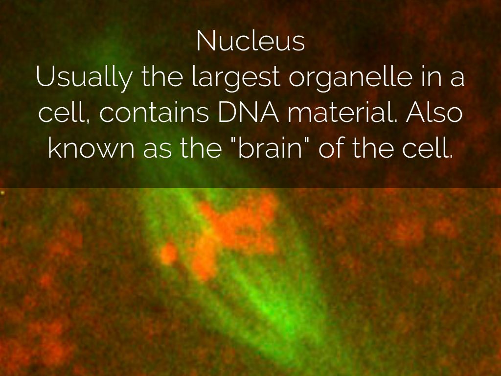 Usually the largest organelle in a cell, contains DNA material. Also known as the "brain" of the cell.