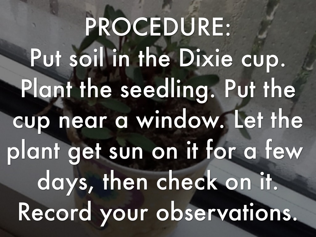 Put soil in the Dixie cup. Plant the seedling. Put the cup near a window. Let the plant get sun on it for a few days, then check on it. Record your observations.