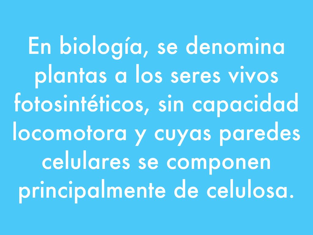 En biología, se denomina plantas a los seres vivos fotosintéticos, sin capacidad locomotora y cuyas paredes celulares se componen principalmente de celulosa.