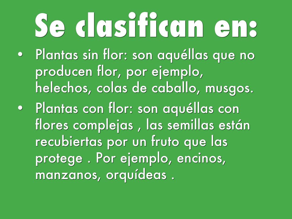 Plantas sin flor: son aquéllas que no producen flor, por ejemplo, helechos, colas de caballo, musgos.