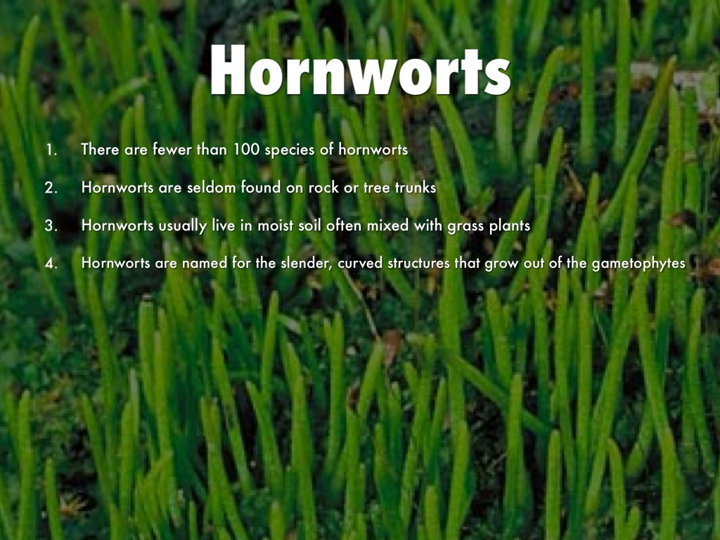 Hornworts are named for the slender, curved structures that grow out of the gametophytes