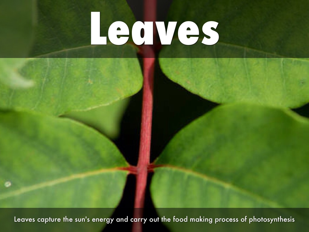 Leaves capture the sun's energy and carry out the food making process of photosynthesis