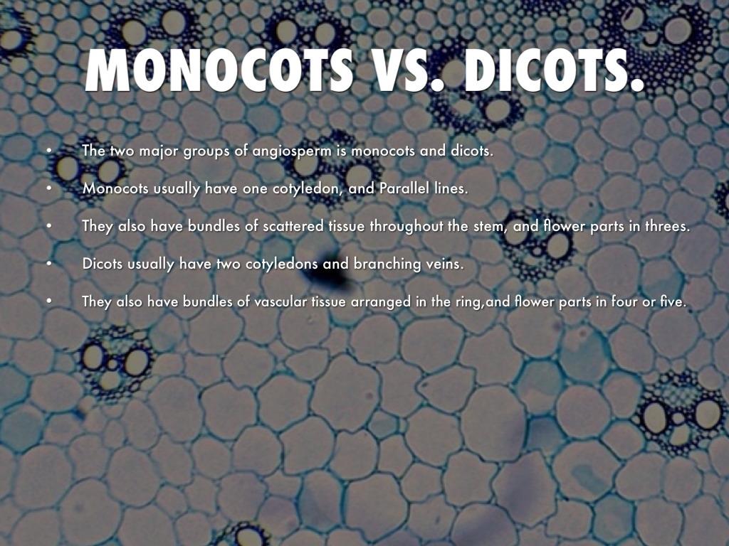 They also have bundles of vascular tissue arranged in the ring,and flower parts in four or five.