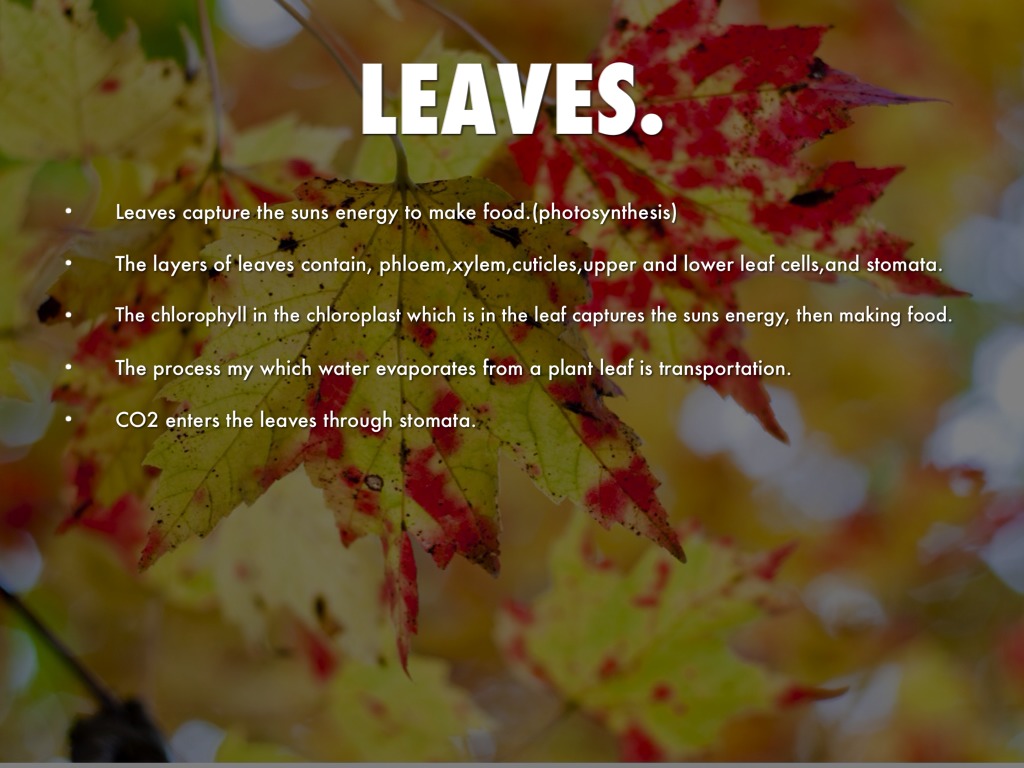 The layers of leaves contain, phloem,xylem,cuticles,upper and lower leaf cells,and stomata.