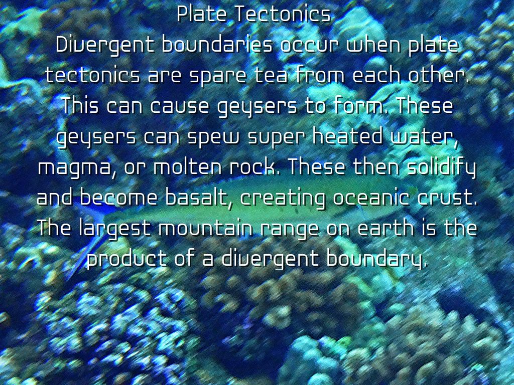 Plate Tectonics Divergent boundaries occur when plate tectonics are spare tea from each other. This can cause geysers to form. These geysers can spew super heated water, magma, or molten rock. These then solidify and become basalt, creating oceanic crust. The largest mountain range on earth is the product of a divergent boundary.