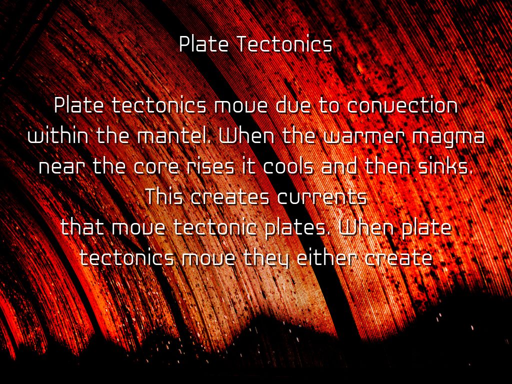 Plate tectonics move due to convection within the mantel. When the warmer magma near the core rises it cools and then sinks. This creates currents that move tectonic plates. When plate tectonics move they either create convergent boundaries or divergent boundaries. Continued on next page ...