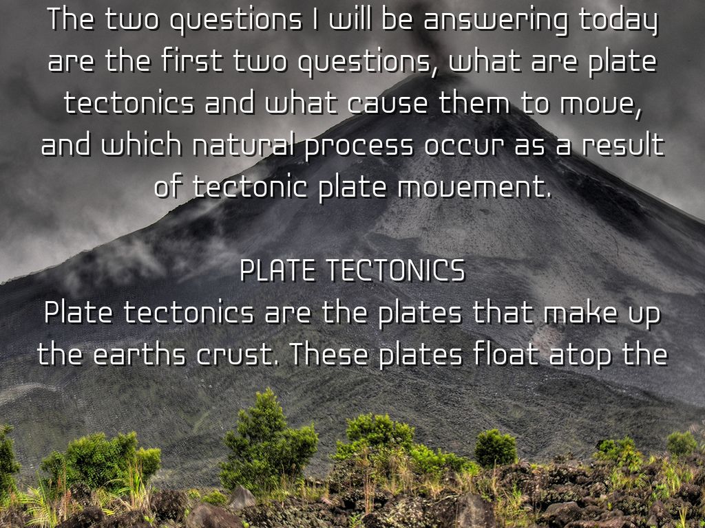 The two questions I will be answering today are the first two questions, what are plate tectonics and what cause them to move, and which natural process occur as a result of tectonic plate movement.