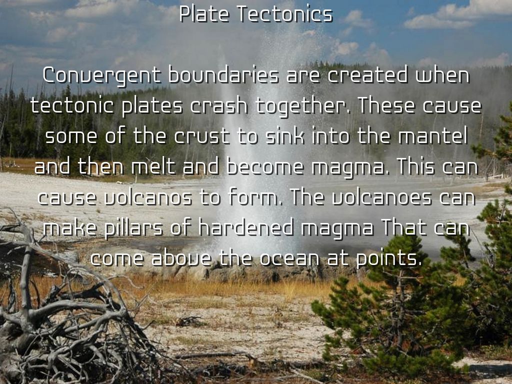 Convergent boundaries are created when tectonic plates crash together. These cause some of the crust to sink into the mantel and then melt and become magma. This can cause volcanos to form. The volcanoes can make pillars of hardened magma That can come above the ocean at points. Continued on next page ...