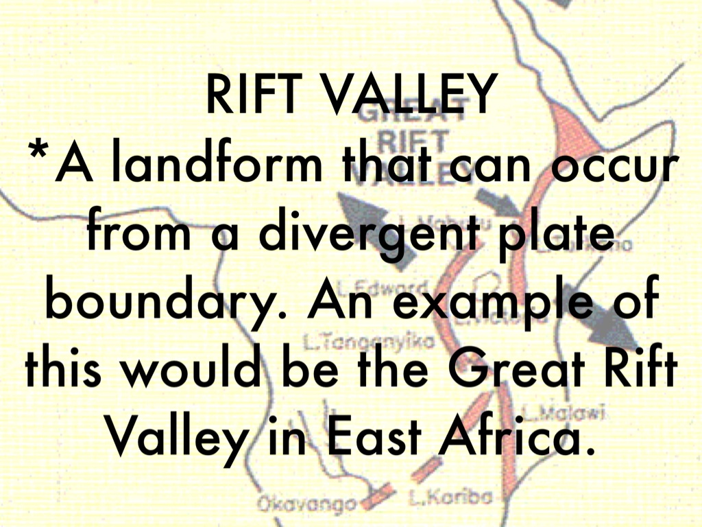 *A landform that can occur from a divergent plate boundary. An example of this would be the Great Rift Valley in East Africa.