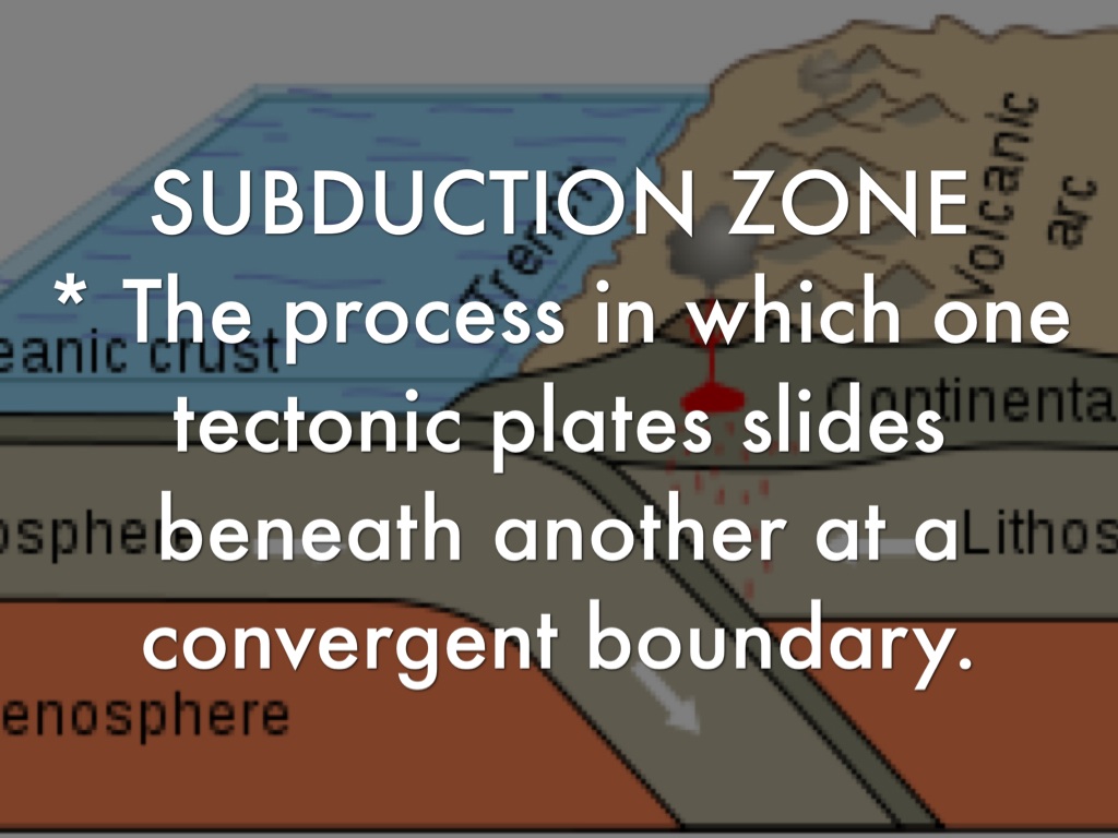 * The process in which one tectonic plates slides beneath another at a convergent boundary.