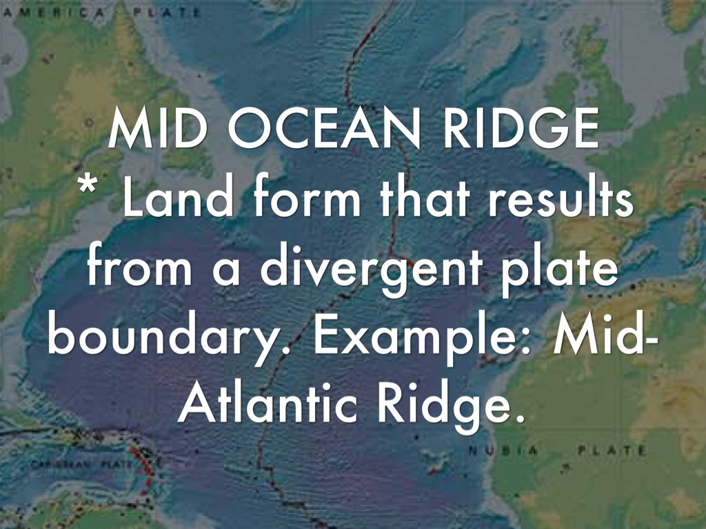 * Land form that results from a divergent plate boundary. Example: Mid-Atlantic Ridge.