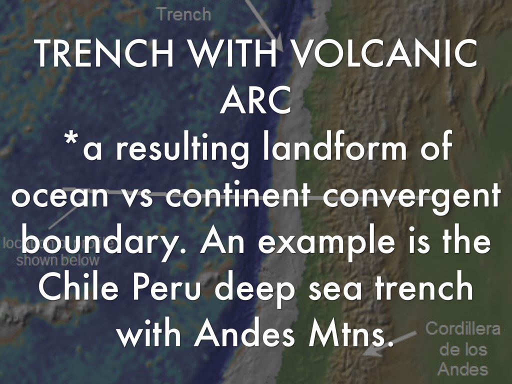 *a resulting landform of ocean vs continent convergent boundary. An example is the Chile Peru deep sea trench with Andes Mtns.