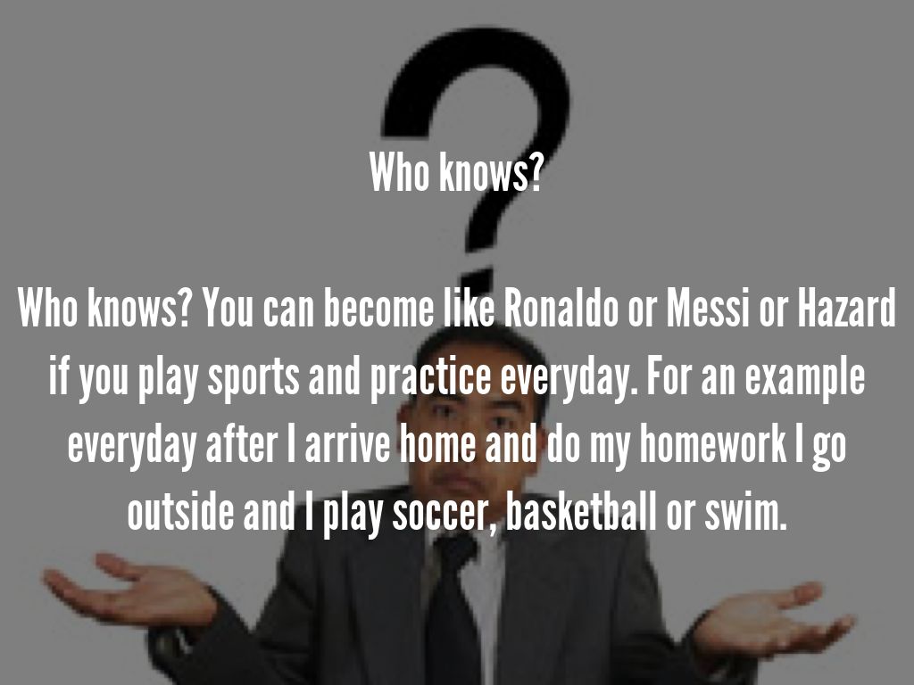 Who knows? You can become like Ronaldo or Messi or Hazard if you play sports and practice everyday. For an example everyday after I arrive home and do my homework I go outside and I play soccer, basketball or swim.