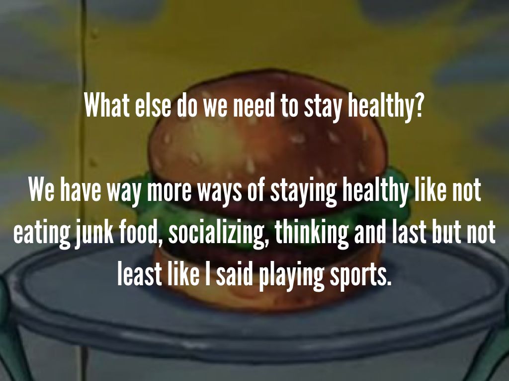 We have way more ways of staying healthy like not eating junk food, socializing, thinking and last but not least like I said playing sports.