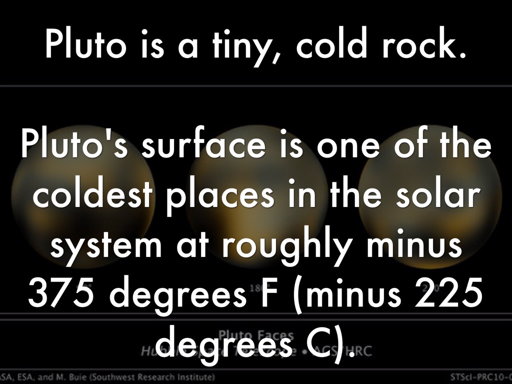 Pluto's surface is one of the coldest places in the solar system at roughly minus 375 degrees F (minus 225 degrees C).