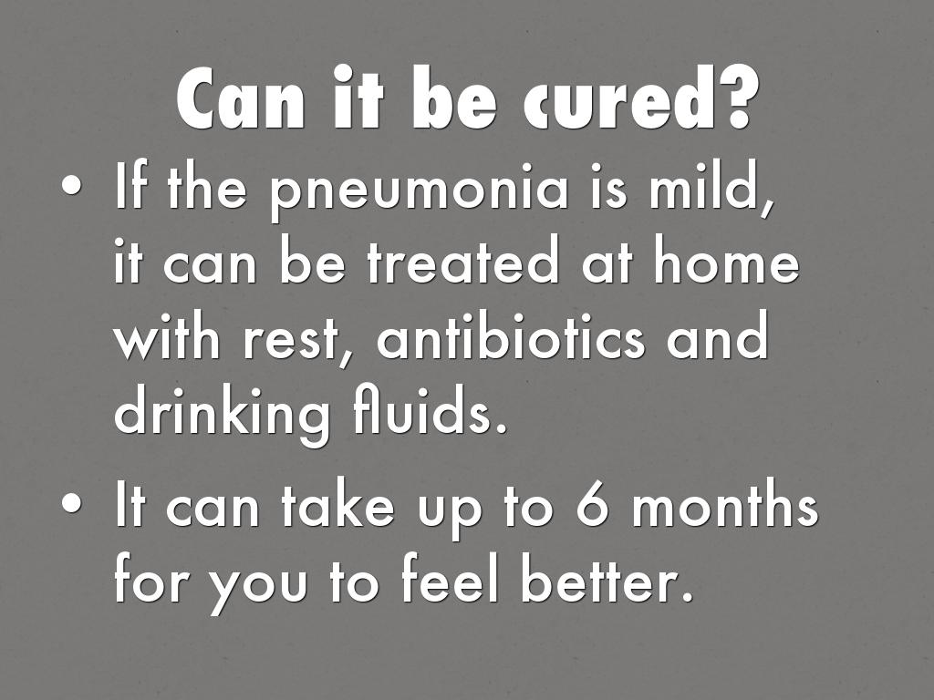 If the pneumonia is mild, it can be treated at home with rest, antibiotics and drinking fluids.